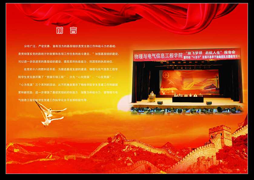 “党旗引领工程”将党员的教育贯穿在一个系统的引领过程中,核心在于“引领”。学院以学生支部为组织单位,以学生党员和入党积极分子为活动主体,每年根据当前社会形势和学生思想实际,坚持围绕一个主题集中开展党建活动,并将每年的11月份确定为学生党建活动主题月,系统实施三个引领。几年来,以“感恩教育”、“社会责任教育”、“雷锋学习教育”、“地球一小时教育”“学习张丽莉教育”为主题,共组织了多项主题活动。2010年的“学会感恩,共创和谐——青春与责任同行”主题党建活动,以感恩教育为切入点系统引领学生的感恩意识;2011年,恰逢建党九十周年,党建活动以“党旗引领 争做先锋”为主题,以先锋教育为切入点,使学生党员在重温党的光辉历史和革命传统教育过程中进一步增强党性意识。2011年的“12.9学习红色革命”主题党建活动,以红色革命为切入点,激发学生党员同祖国同呼吸、共命运,投身建设的使命感,培养党员强烈的爱国责任感;2012年的“大美大爱张丽莉”主题党建活动,结合我校毕业生张丽莉的事迹,以责任教育为切入点,弘扬高尚师德教育。
