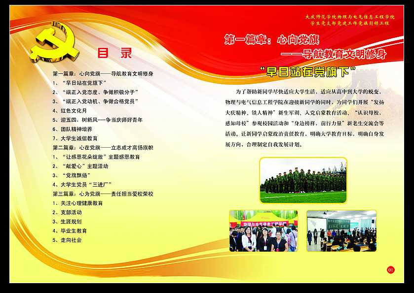 taptap点点官方网站始终将端正学生入党动机、发挥党员示范作用和支部主题活动作为学生党建工作的重要抓手。通过实施三个引领,即:“心向党旗”入党动机的引领、“心在党旗”示范作用的引领、“心为党旗”主题活动的引领,将党员的教育管理贯穿大学教育的始终。在“心向党旗”系列,通过组织新生入党启蒙、“早日站在党旗下”入党教育等活动,帮助学生深化对党的认识,引导其积极向党组织靠拢;在“心在党旗”系列,通过组织学生党员参加各种活动,树标兵,做模范,切实发挥党员的先锋模范作用,实现党员示范作用的引领;在“心为党旗”系列,通过开展主题活动,进一步提高学生党支部的影响力和战斗力,引导广大学生党员积极关注社会,感受责任,坚定信仰,实现党员主题活动的引领。在创先争优活动中,学生党支部将多年来始终坚持的三个引领,正式定名为“党旗引领工程”。