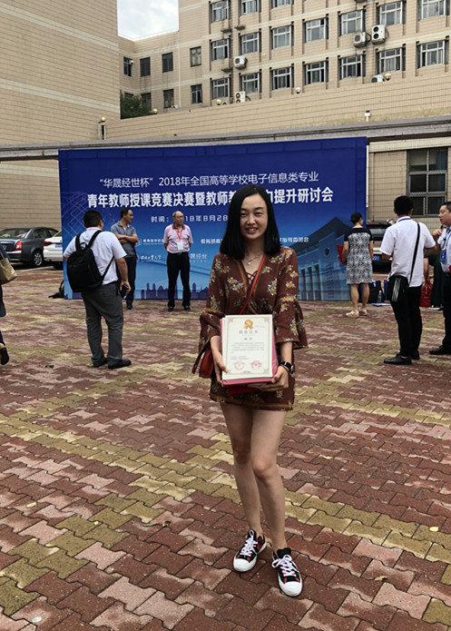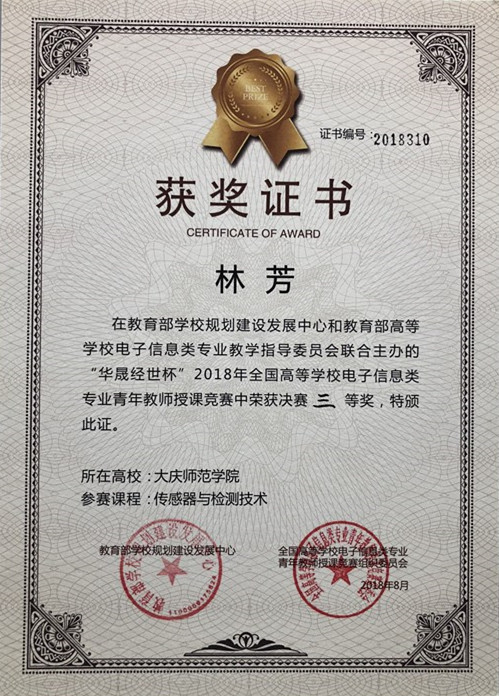 2018年8月30日,由教育部学校规划建设发展中心、教育部高等学校电子信息类专业教学指导委员会联合主办的“华晟经世杯”2018年全国高等学校电子信息类专业青年教师授课竞赛,在河北工业大学举行决赛。本次竞赛从2018年1月份开始,历时8个月,全国100多所高校,包括南京邮电大学、国防科技大学和哈尔滨工程大学等电子信息类知名大学,400多名教师报名参赛。我校taptap点点官方网站林芳老师在获得初赛华北赛区二等奖后,在决赛中获得全国三等奖。