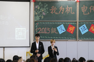 活动以2015级各班班长演讲的形式开展,通过各班班长和团支书的精心策划和紧密配合将本班级精神面貌和优秀班风展现在大屏幕上。在主持人慷慨激昂地演讲开场白后,“我为机电代言”文明班级评选活动正式拉开帷幕。伊始,由各班班长和团支书播放事先准备的视频,该视频展示了班级经历的风雨历程,也体现了各班的文明风貌。全场观众掌声不断,笑声连连。随后展示的PPT由班长进行解说、团支书进行放映,进一步体现了班级的优秀班风,将全场的气氛推向高潮。每个班级的班长风格不同,但相同的是都在用心表达着对班级集体的热爱。评选活动临近尾声,赵亮老师发表总结讲话,表达了对本次活动的支持与肯定,并提出了自己的建议。