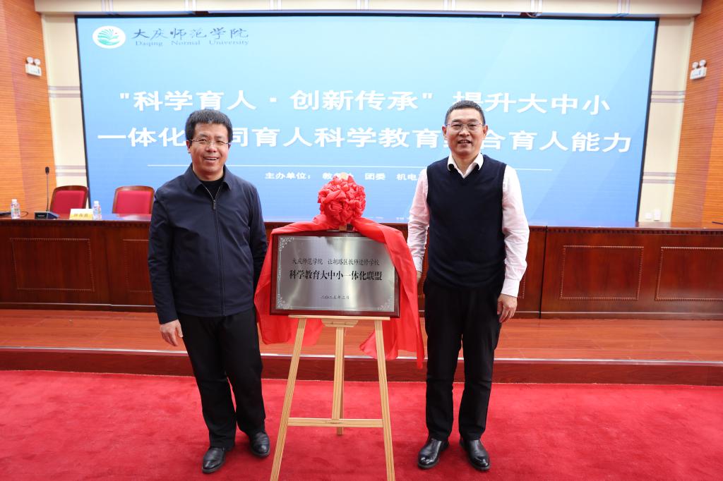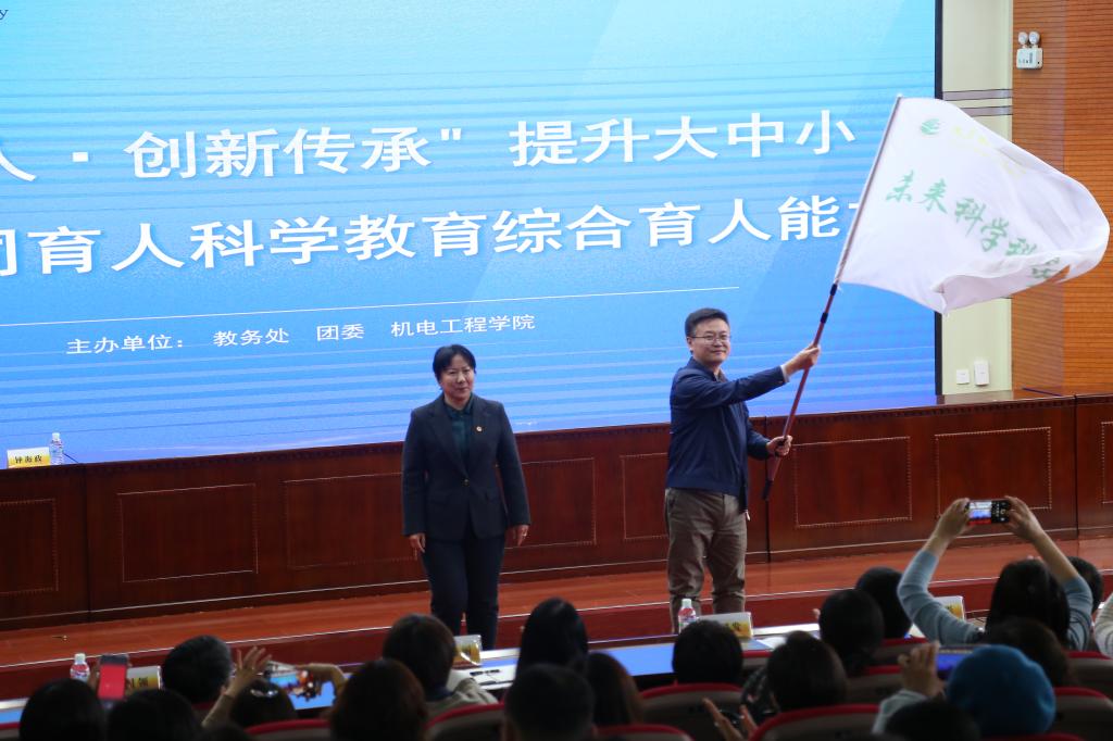教务处处长张国发致辞,他强调我校成立60年来,始终坚守师范教育第一职责,践行“为党育人、为国育才”初心使命,积极响应国家号召,主动深化教育教学改革,探索高等教育与基础教育深度融合的新路径。随后,教务处处长张国发与让胡路区教师进修学校崔海彬校长共同为科学教育大中小一体化联盟揭牌。校团委书记王贺民为“未来科学科普社团”授旗,社团首任指导教师、taptap点点官方网站院长刘永皓上台接旗。揭牌和授旗仪式标志着区域科普协同育人平台正式启动。