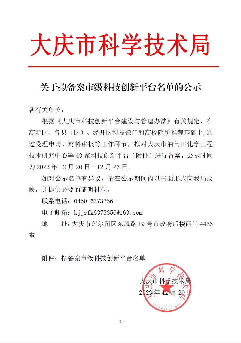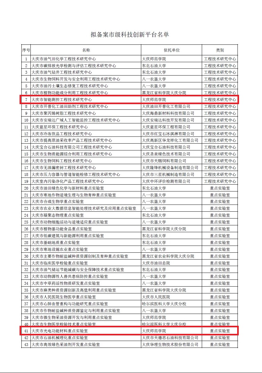 近日,大庆市科学技术局公布了市级科技创新平台名单,全市合计43家科技创新平台入选。taptap申报的“大庆市智能测控工程技术研究中心”、“大庆市光电功能材料重点实验室”成功获批备案。