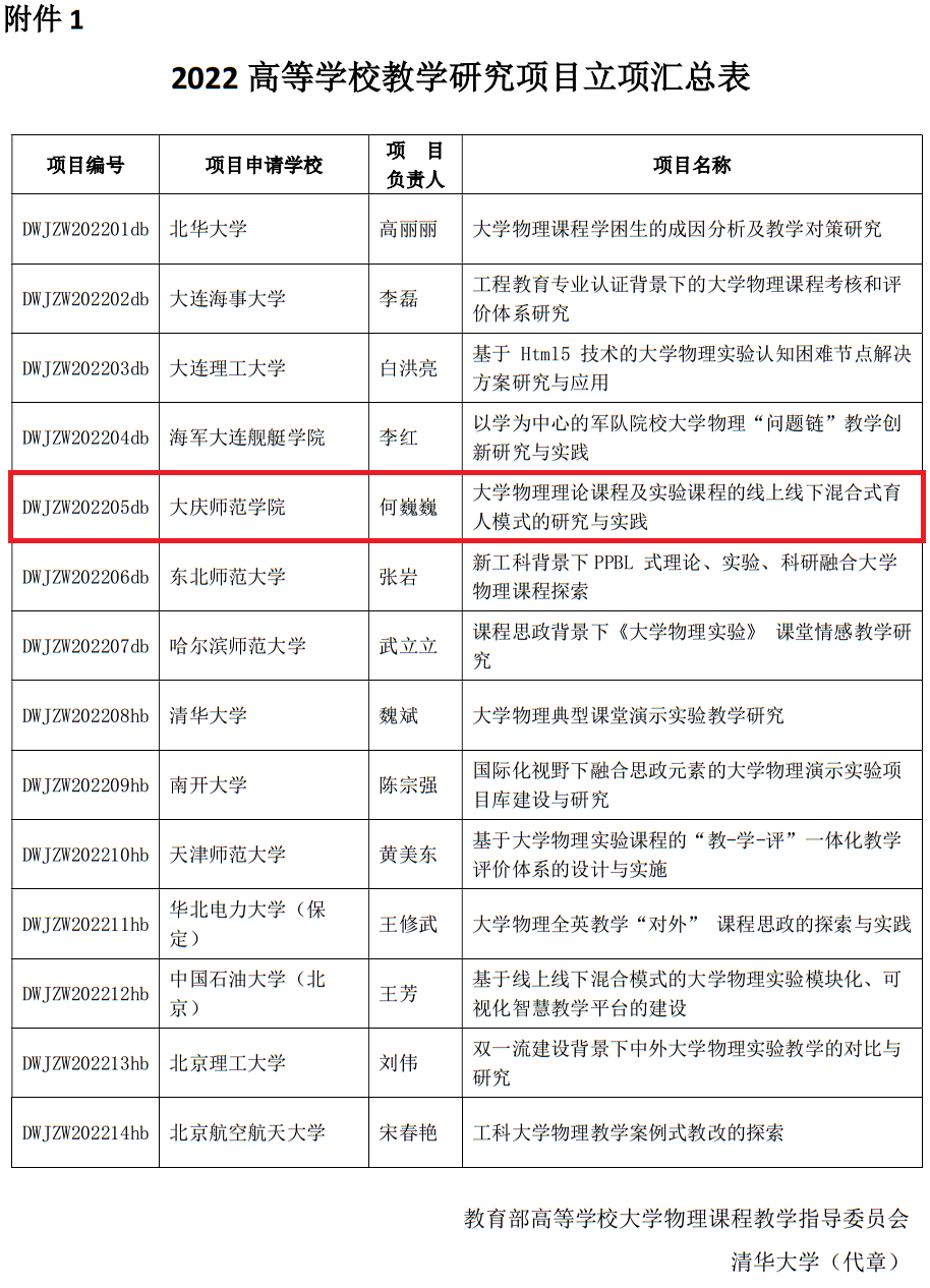 8月3日,2022年度教育部高等学校大学物理教学指导委员会教学研究项目立项名单正式发布,taptap基础物理教研室主任何巍巍老师主持的“大学物理理论课程及实验课程的线上线下混合式育人模式的研究与实践”项目成功获批。全国各类院校获批立项40项,东北地区仅7项。